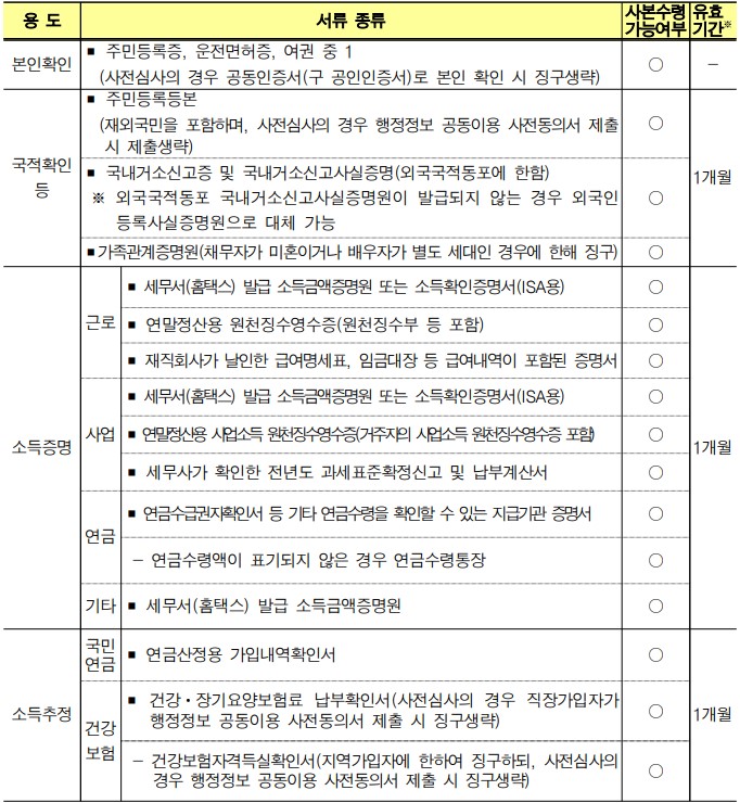 위와 같이 온라인 / 모바일을 통해 쉽게 로그인하여 신청이 가능합니다. 신청 후 대출 심사를 받을 경우 아래의 서류를 제출해야하는데요. 유효기간이 3개월이 아닌 1개월이니 최신본으로 준비하시기 바라며, 사본으로 제출할 수 없는 서류들이 있습니다. 보금자리론 신청시 서류제출 자동화(스크래핑) 서비스를 동의하시는 경우 심사서류가 자동 제출되기 때문에 아래의 서류를 별도로 제출하셔야하기 때문에 서비스를 신청하시면 서류 제출을 쉽게 하실 수 있습니다.