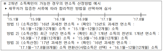기본적으로 2개년 증빙소득을 확인하게 됩니다.(2개년 소득의 차이가 20%이하인 경우 최근년도의 연소득으로 산정하며 그 이상 차이가 나는경우 2개년 연소득의 평균으로 산청합니다.)