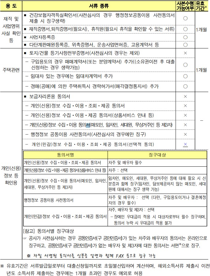위와 같이 온라인 / 모바일을 통해 쉽게 로그인하여 신청이 가능합니다. 신청 후 대출 심사를 받을 경우 아래의 서류를 제출해야하는데요. 유효기간이 3개월이 아닌 1개월이니 최신본으로 준비하시기 바라며, 사본으로 제출할 수 없는 서류들이 있습니다. 보금자리론 신청시 서류제출 자동화(스크래핑) 서비스를 동의하시는 경우 심사서류가 자동 제출되기 때문에 아래의 서류를 별도로 제출하셔야하기 때문에 서비스를 신청하시면 서류 제출을 쉽게 하실 수 있습니다.