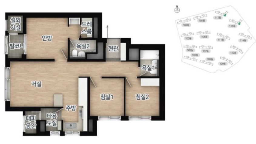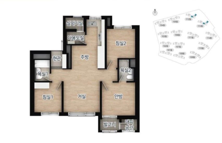 24평형의 집은 모두 112동과 113동에 모여있습니다. 정남향 또는 남동향의 집으로 층수가 높은 경우 채광이 좋을 것으로 보여집니다. 59A타입의 경우 별도 파우더룸이 없는데요. 공간을 별도로 활용하셔야 할 것 같습니다. 그리고 실외기실이 생각보다 넓게 빠져있네요.