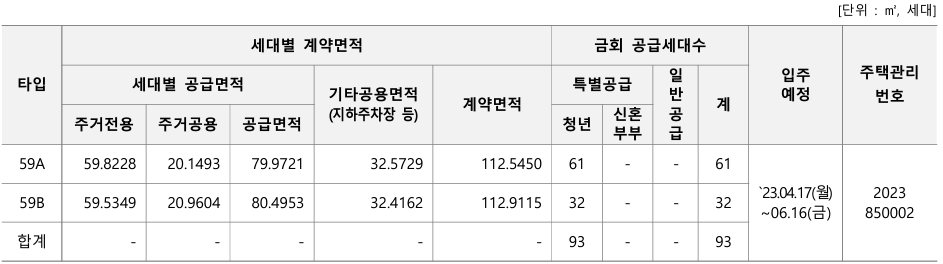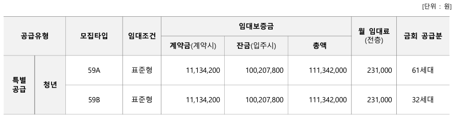 총 1,328세대 중 93세대로 모두 59형의 특별공급(청년)만 모집하고 있습니다. 해당 세대에서는 대부분 셰어형으로 나왔지만 셰어형은 다른 사람과 나눠써야하기 때문에 인기가 없어서 공가로 나온 것 같습니다. 원래 84, 72타입도 있지만 공가가 발생하지 않아 금번 모집에는 추가되지 않은 것으로 보입니다.