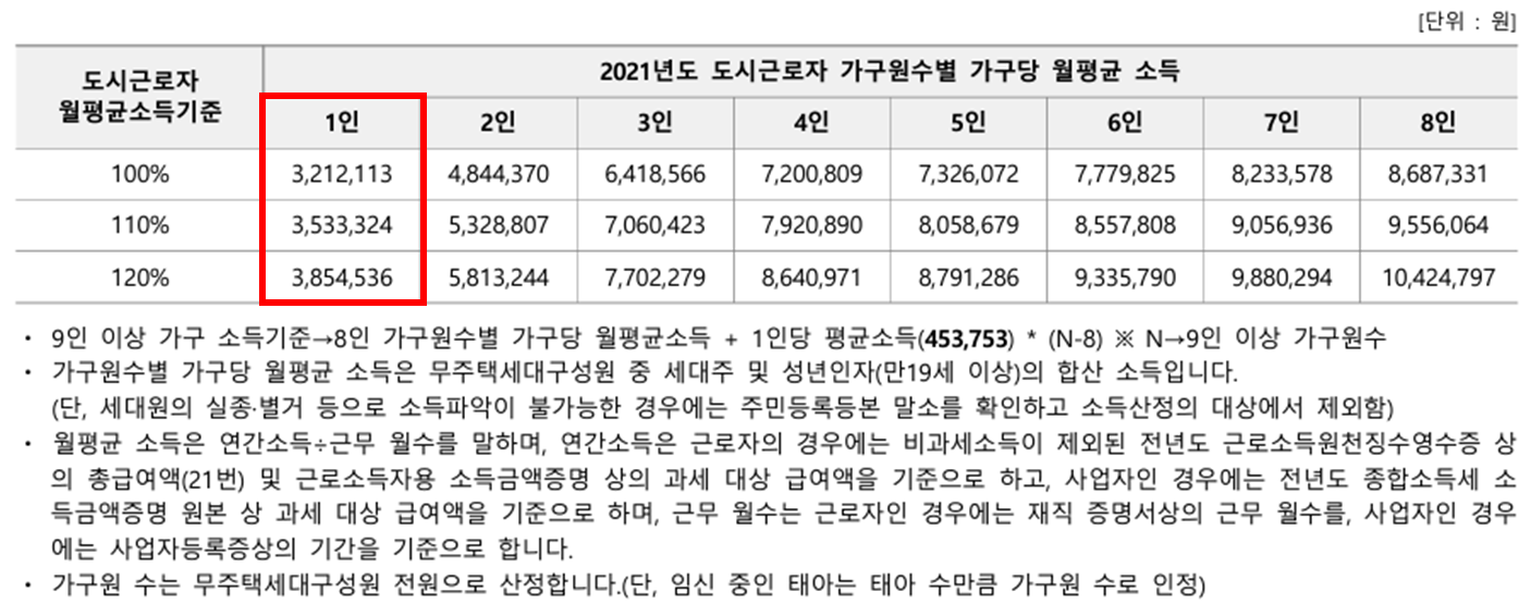 - 소득 : 아래의 기준을 만족해야 합니다.(2021년도 기준)