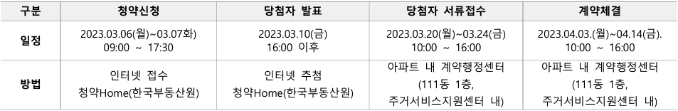 - 청약은 3.6(월)~7(화) 양일간 진행되며 당첨자는 3.10(금) 16시에 바로 발표 예정입니다.