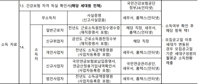 소득의 경우 모집공고일 기준에서의 기준을 바탕으로 해당하는 항목에서 한가지를 선택하셔서 준비하시면 됩니다. 사업과 근로를 모두 하고 계신경우 한가지만 선택하셔도 되겠습니다.