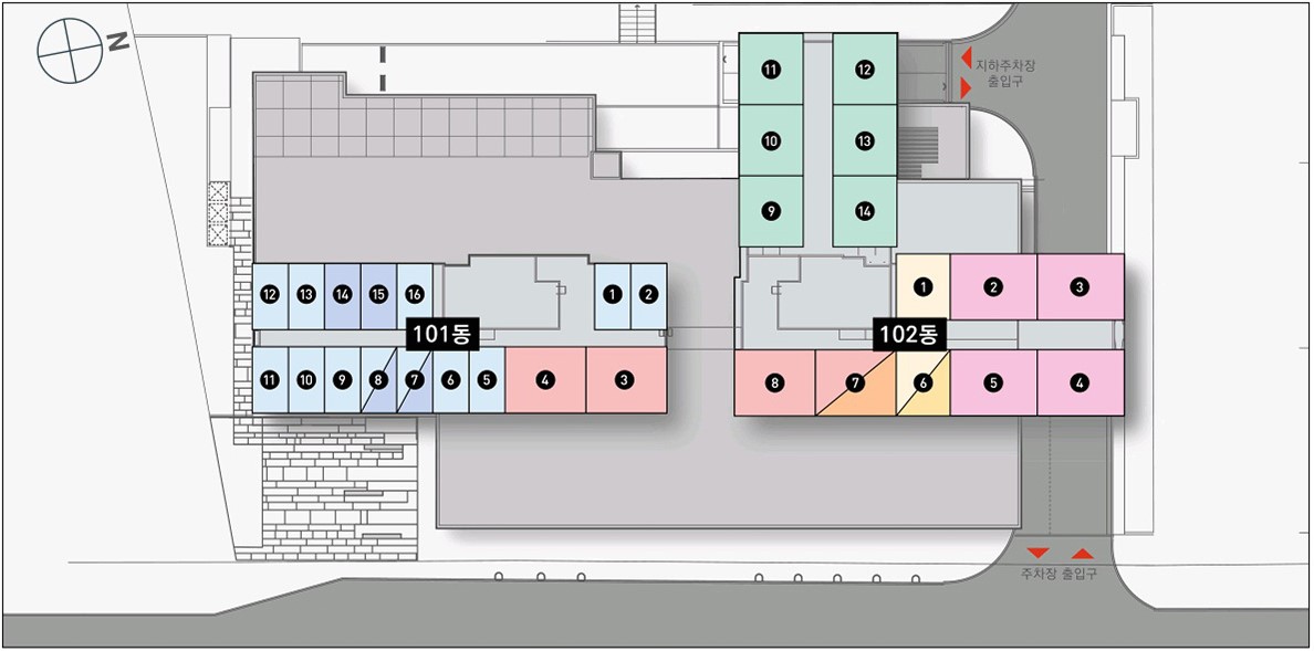 단지는 101, 102동으로 2개 동으로 구성되어있습니다. 101동에 청년형 소형평수의 주택이 몰려 있으며 36형과 섞여있습니다.