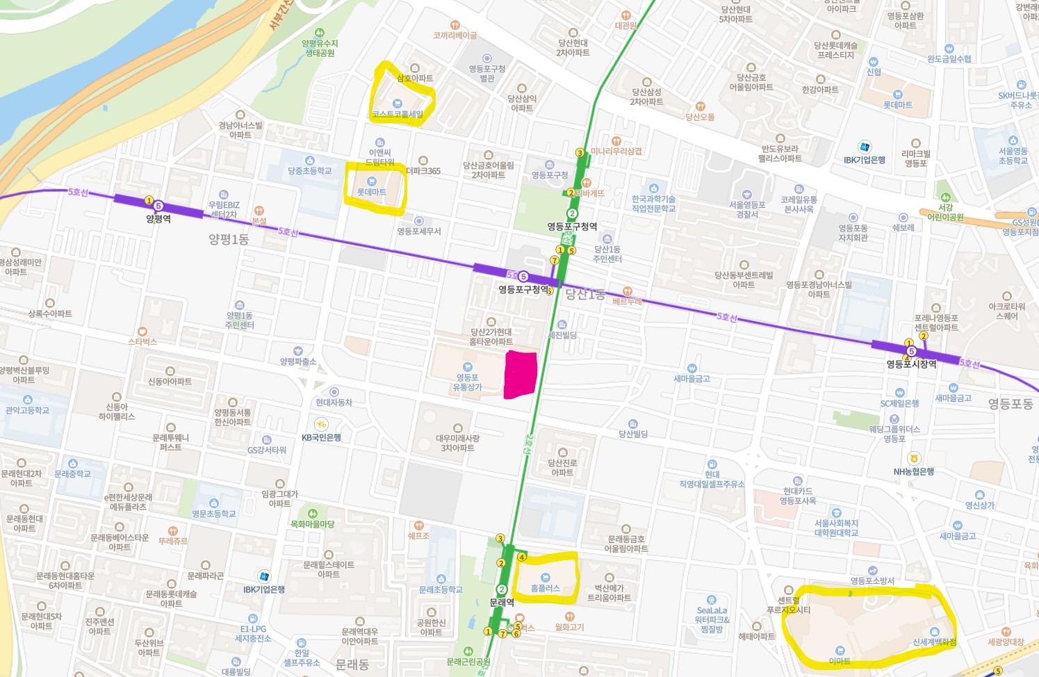 주변으로 대형 마트들이 즐비해있고, 타임스퀘어, 문래동, 영등포유통상가를 도보로 이용할 수 있는 거리기 때문에 생활권은 아주 좋아보입니다. 여의도역까지 5분이 소요되며 서울 시내는 30분 이내로 이동이 가능하기 때문에 교통도 아주 편리한 위치입니다.