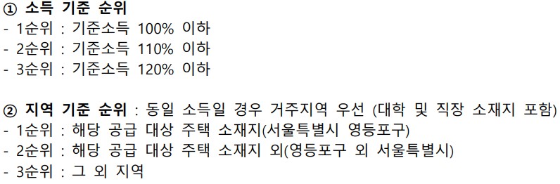 특별 공급 선정 기준은 '소득순위 → 지역순위 → 추첨' 순으로 결정됩니다. 그렇기 때문에 소득은 무조건 100%가 되어야 당첨 가능성이 있습니다.(아래의 특별공긍 선정 기준 참고)