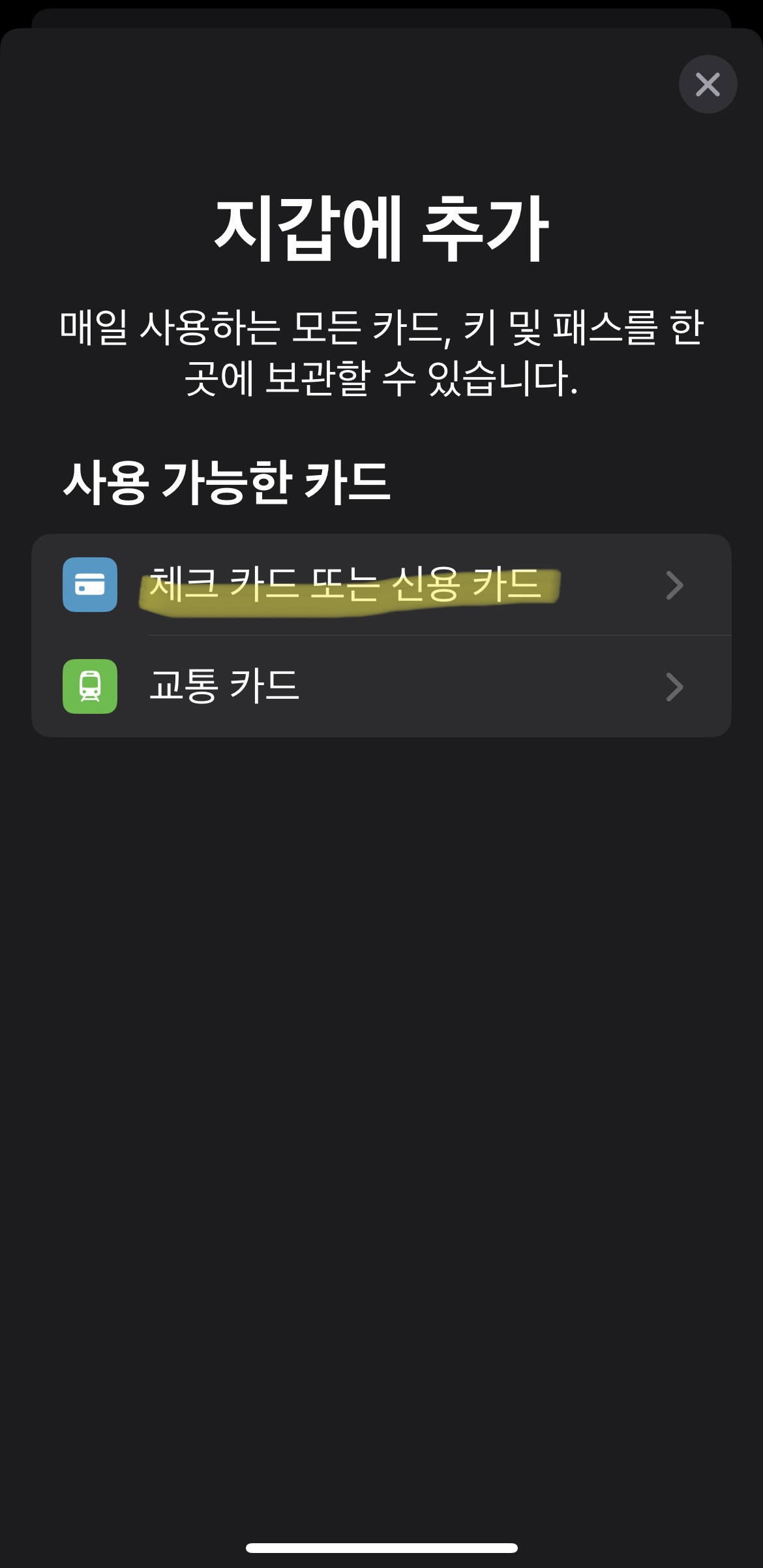 지갑에 등록할 카드는 현대카드이므로 '체크 카드 또는 신용 카드'를 클릭해주세요. 교통카드의 경우 아직 한국에서는 지원되지 않습니다. 티머니 카드와 같은 교통카드는 애플페이 적용까지 시간이 좀 걸릴 것 같습니다.