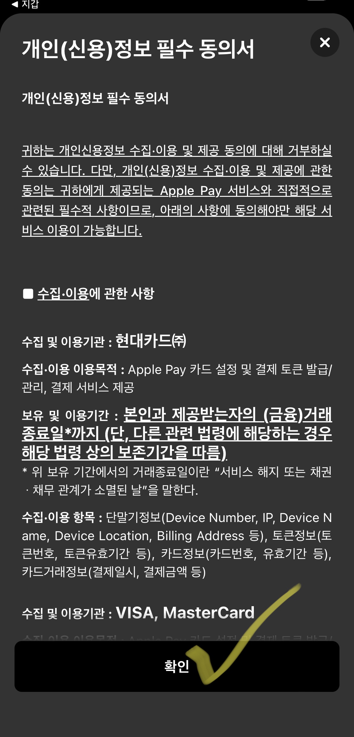 두가지 항목에 동의를 해야하는데요. 현대카드와 비자, 마스터카드에 정보 제공에 대한 내용입니다. 카드에 대한 필수 정보(카드번호, 유효기간, 결제정보 등)를 현대카드와 중개하는 비자와 마스터카드에게 제공하는 것입니다. 비자와 마스터카드는 미국이 본사이기 때문에 미국으로 정보가 제공됩니다. 필수항목으로 동의하지 않는 경우 애플페이 현대카드는 이용이 불가합니다.