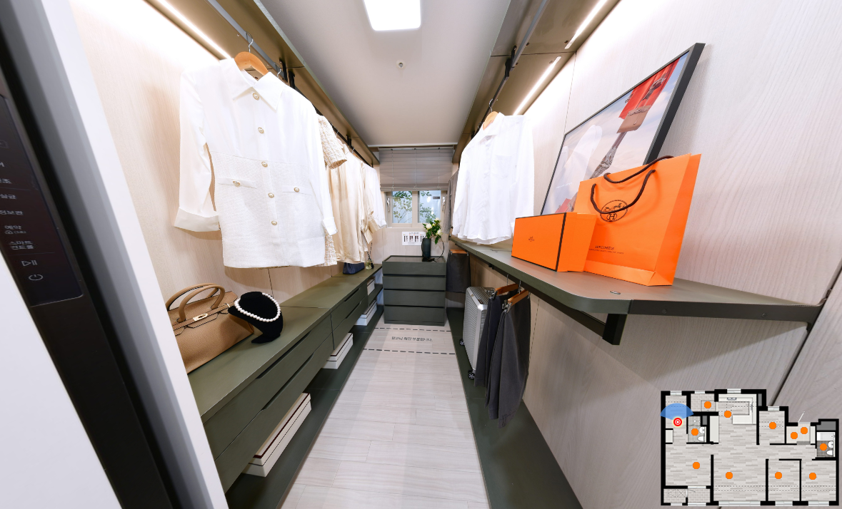 안방에 설치된 드레스룸입니다. 옵션 미선택시 일반 벽면 시공 및 선반이 제공되지 않습니다. 현장에는 의류관리기도 있지만 의류관리기 또한 옵션에서 선택하지 않으실 경우 비어있게 됩니다. 그리고 위 사진에서는 보이지 않지만 드레스룸 입구에 가구 도어가 설치되어있지만 옵션 미선택시 설치되지 않습니다.