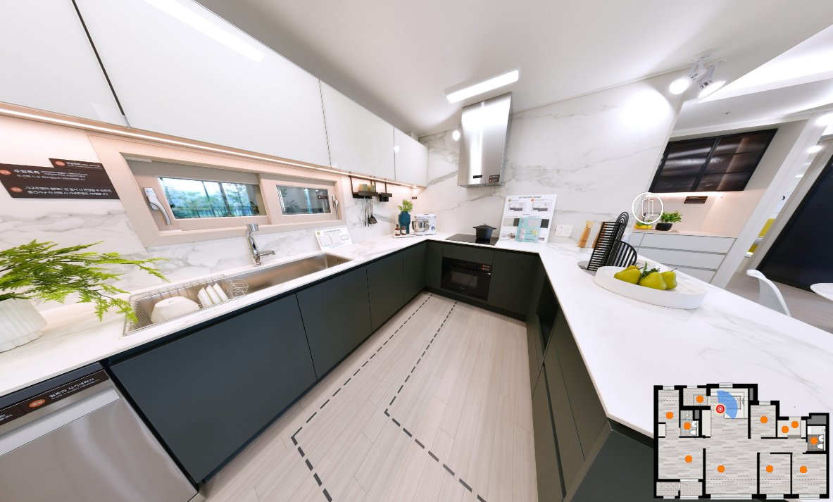 부엌의 경우 아일랜드가 아닌 'ㄷ'자형의 구조로 되어있습니다. 아트월과 동일하게 벽면을 채웠고 상판도 디자인이 유사한 세라믹 타일로 되어있지만 해당 설치본은 유상 옵션으로 선택된 사항이 적용되어 그런 것입니다. 옵션 미선택시 일반 민무늬인 인조대리석으로 시공될 예정입니다. 싱크대의 경우에도 사각이 아닌 일반 싱크대로 설치되니 옵션사항을 미리 확인하시는 게 좋을 것 같습니다.