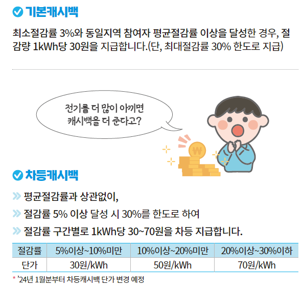 캐시백은 산정된 달의 다음달 전기 요금에서 차감하여 청구됩니다. 주의하실 사항으로 참여 기간 중에 주소지가 변경되거나 해당 전기사용장소에서 실거주하지 않는 고객은 캐시백 지급 대상에서 제외됩니다.