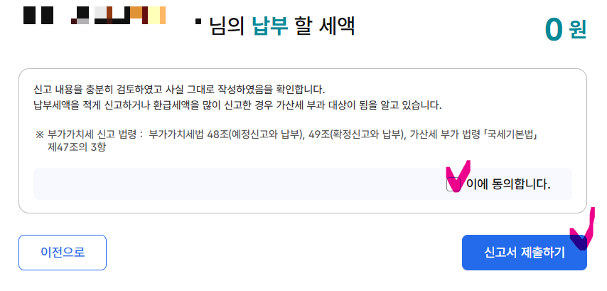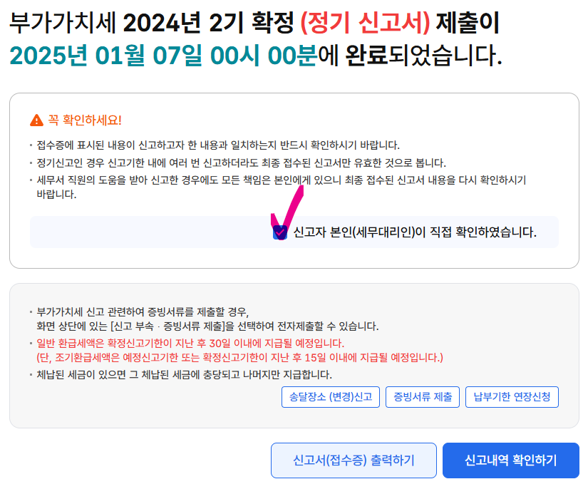 납부한 세액을 적게 신고하거나 환급 세액을 많이 신고하게 되면 가산세가 부과될 수 있다고 하는 안내문이며, 무실적 신고와는 무관하기에 동의하기와 신고서 제출을 진행하면 됩니다. 그리고 마지막으로 본인의 책임이라고 하는 안내문이 있는데 체크하고 다음으로 넘어가야 최종적으로 신고가 완료됩니다.