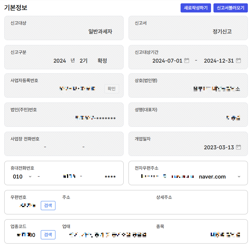위와 같이 화면이 나오실텐데 여기서 '사업자등록번호'에서 사업자를 선택하시면 사업자에 대한 기본정보가 자동으로 화면에 나타나게 됩니다.