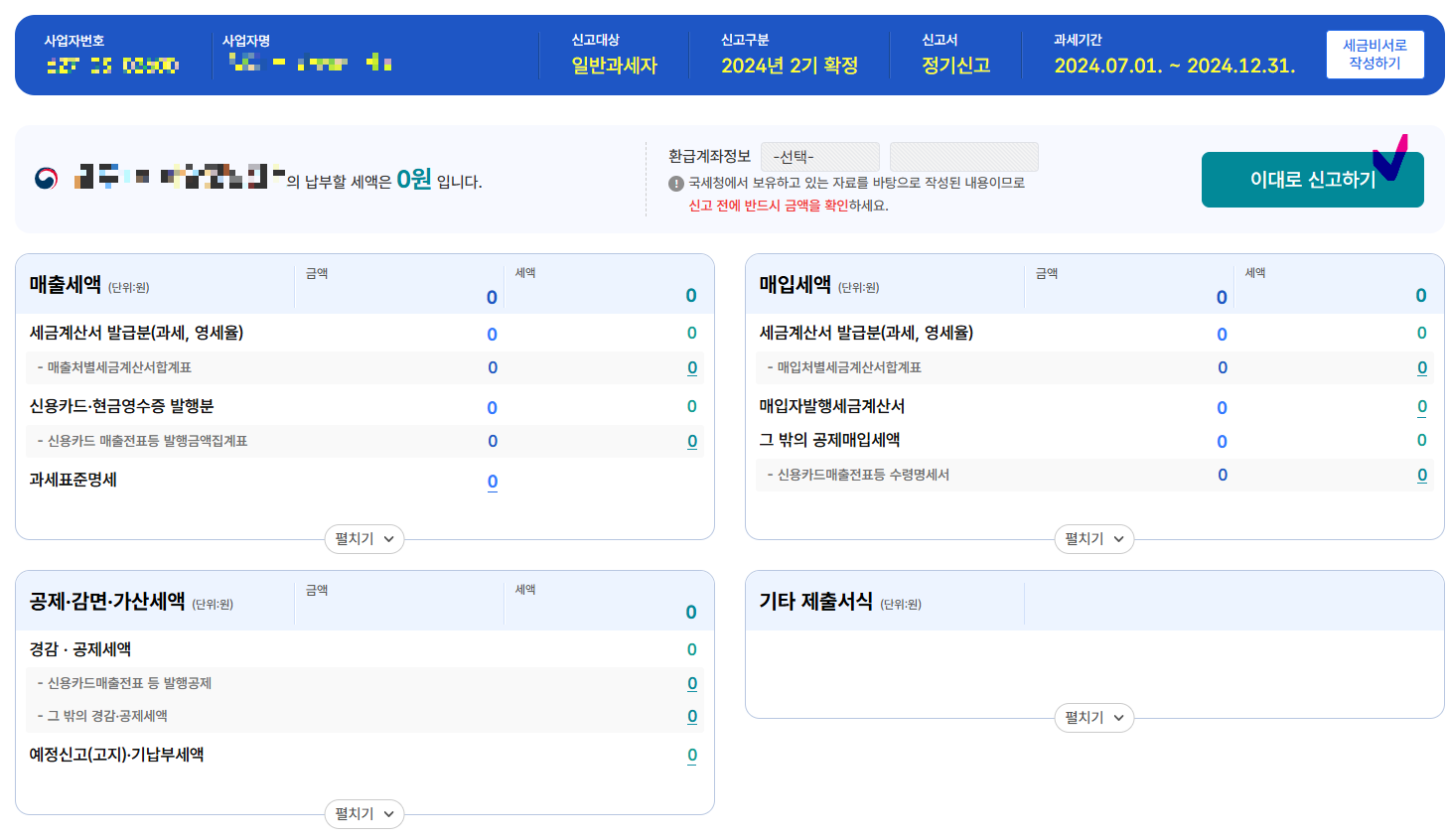 저장하기를 눌러 다음 화면으로 넘어가면 아래와 같은 화면이 나오는데요. 매출과 매입 모두 0으로 나오는 것을 확인하실 수가 있습니다. 여기서 우측 상단에 이대로 신고하기를 눌러주세요.