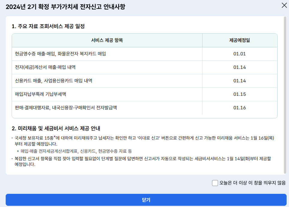 정기확정신고를 클릭하는 경우 아래와 같은 안내문이 나오게 됩니다. 세금 신고를 위한 자료가 국세청에 자료가 업데이트 되는 시점을 안내해놓은 자료인데요. 무실적 신고는 매입매출이 없기 때문에 그냥 넘어가시면 됩니다. 매입 매출이 생기시면 그때 참고하시면 되겠습니다.
