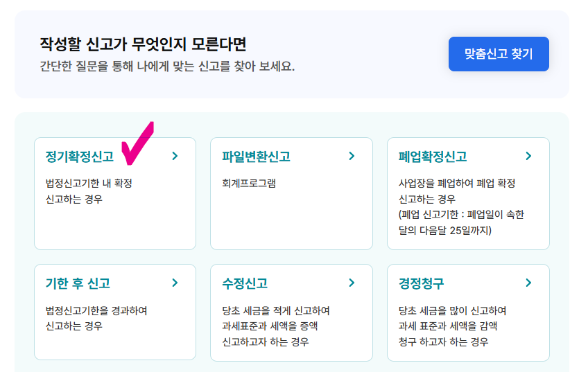 작년도 실적을 1월에 부가세 신고하는 것이라면 아래 화면에서 정기확정신고를 눌러주시면 됩니다. 무실적 신고를 하시는 분이라면 대부분 기간 내에 진행하시는 신고자이시니 정기확정신고를 클릭해주시면 됩니다.