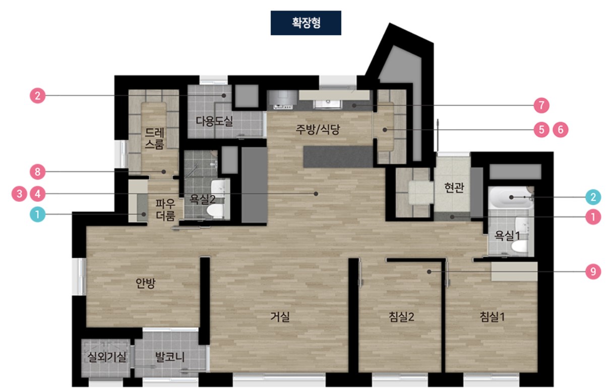 이 아파트에서 가장 좋은 방향 및 평면도를 가진 집은 84A입니다. 저는 무조건 84A를 추천드립니다. 세탁기, 건조기도 수평으로 쉽게 놓을 수 있는 크기이고 환기에도 용이한 주택평면입니다.