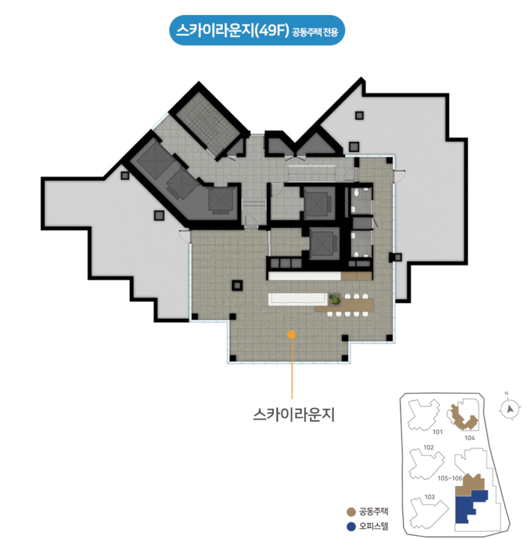 49층의 고층으로 설계되었기 때문에 장점이 있습니다. 바로 49층에 스카이라운지가 있다는 점인데요. 이런 광경을 아파트 주민만이 느낄 수 있다는 것이 큰 장점인 것 같습니다. 이 스카이 라운지는 바로 아파트 주민만 이용할 수 있다는 것입니다. 105동-106동 사이에 설계되었으며 오피스텔과는 분리되어있기에 오피스텔 입주자의 경우 분리되어 사용하기는 어렵습니다.