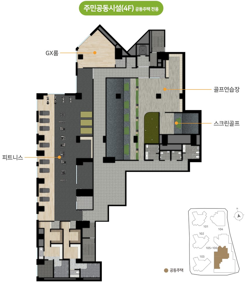 헬스장 및 세탁소 등은 모두 분리되어 아파트 세대와 오피스텔 세대를 완전히 분리하였습니다. 오피스텔의 경우 공유오피스를 사용할 수 있는 장점만 있는 것 같습니다.