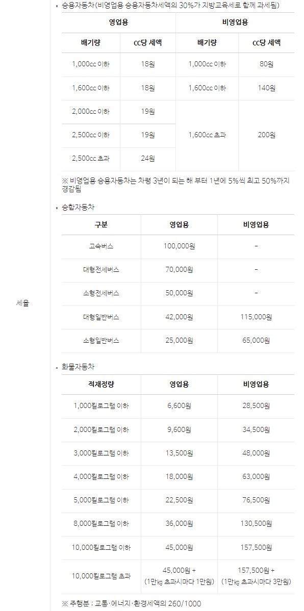 아래와 같이 영업용 차량(버스, 화물차)이나 배기량이 적은 차량의 경우 자동차세가 낮은 것을 알 수 있습니다.
