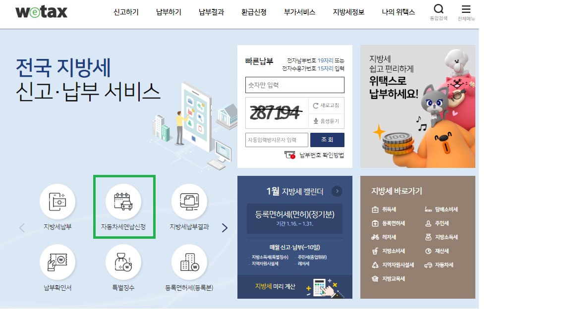 자동차세는 지방세에 해당하기 때문에 ‘위택스’에서 모두 관리되고 있습니다. 위택스 홈페이지에 들어가시면 바로 자동차세 연납신청 버튼이 있어 본인인증을 통한 로그인 후에 바로 신청하실 수 있습니다.