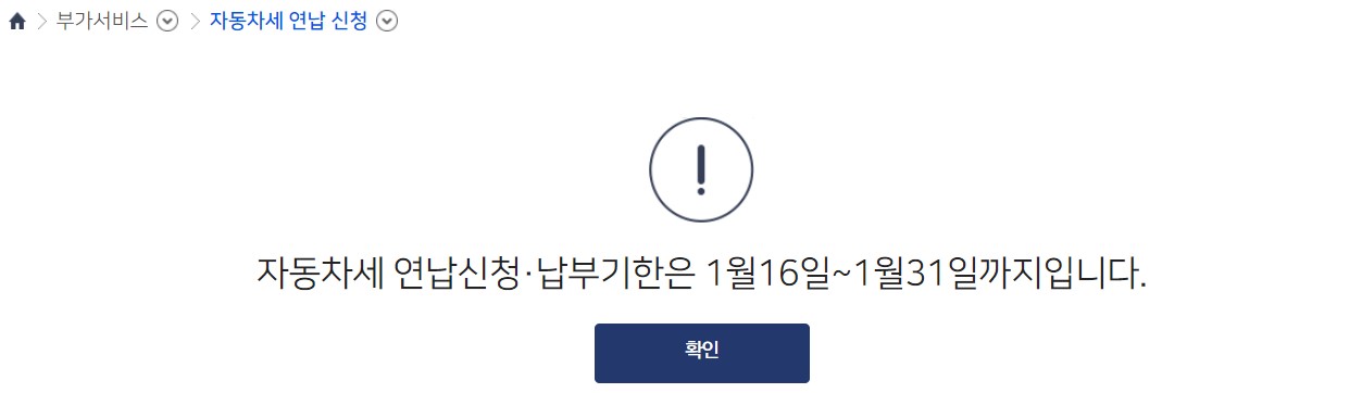 자동차세 연납 신청은 아무때나 신청할 있는 것이 아닙니다. 연납신청은 1월, 3월, 6월 또는 9월의 15일부터 31일(말일)에만 신청할 수 있습니다. 이 시기를 놓치게 되면 6월/12월에 나누어 분납을 하게 되거나 세액공제 비율을 조금 더 낮게 받게 됩니다.