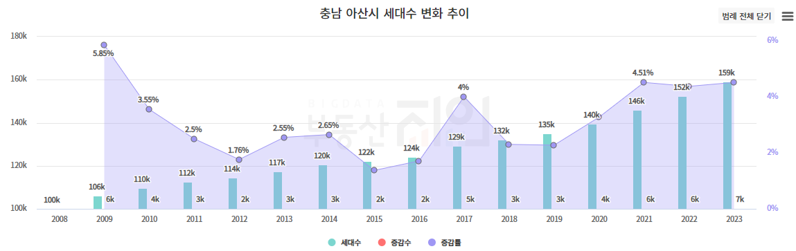 아산시의 경우 지속해서 인구가 증가하는 경향을 보이고 있으며, 인구 증가율도 4.5%대로 큰 증가폭을 보이고 있습니다. 아직 천안시의 인구에 비해 절반 수준으로 적은 수준이지만 천안아산역 주변으로 도시계획을 통해 개발을 진행하고 있어 해당 지역으로 인구를 유입시키는 영향으로 천안시의 인구를 끌어오면서 세대수가 안정적으로 증가하는 것으로 보여집니다.