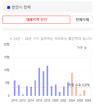 천안시의 경우 세대수는 계속 증가하는 것으로 보이고 있습니다. 다만 그 증가율이 2020년 이후 계속 줄어들고 있어 2024년도에는 세대수가 감소하거나 현재 수준을 유지할 것으로 보여집니다. 그동안 지속해서 세대수가 증가해왔기 때문에 미분양 물량 해소에도 큰 문제가 없었지만 몇 년 뒤에 신축 물량이 기존대비 큰 매리트가 없다면 미분양이 발생하거나 미분양 해소에 어려움이 있을 것으로 예상됩니다.