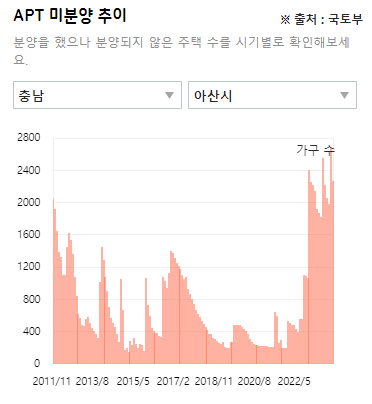 천안시의 경우 미분양 물량이 점점 해소되고 있는 것으로 보이는데 아산시의 경우 미분양이 아직 해소되지 않고 있습니다. 천안시는 과거 2010년과 2018년도에 현재수준과 유사한 수준으로 미분양 물량이 있었다가 해소된 이력이 있습니다. 하지만 아산시의 경우 최근 10년동안 이렇게 까지 큰 물량이 미분양으로 남아있던 적이 없어서 미분양 물량 해소에는 다소 시간이 소요될 것 같습니다.