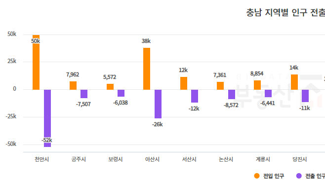 인구가 증가하는 지역의 경우 그만큼 미분양이 해소될 가능성이 크기 때문에 인구는 미분양 해소의 주요 요소이기도 합니다. 위 그래프는 2023년(1년)동안 전입/전출 인원을 나타낸 그래프입니다. 천안시는 인구의 전출이 2,000명 정도 더 많지만 큰 차이는 보이지 않습니다. 아산시의 경우 12,000명 정도가 추가 증가한 것으로 확인됩니다. 확인 결과, 천안시 인구는 보통 아산시로 많이 이동하며 아산시의 인구는 천안시로 많이 이동하는 것으로 확인되었습니다. 이를 통해 천안아산의 인구는 서로 영향을 받고 있다고 보시면 될 것 같습니다.