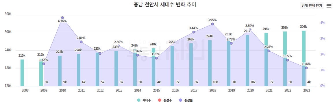 천안시의 경우 세대수는 계속 증가하는 것으로 보이고 있습니다. 다만 그 증가율이 2020년 이후 계속 줄어들고 있어 2024년도에는 세대수가 감소하거나 현재 수준을 유지할 것으로 보여집니다. 그동안 지속해서 세대수가 증가해왔기 때문에 미분양 물량 해소에도 큰 문제가 없었지만 몇 년 뒤에 신축 물량이 기존대비 큰 매리트가 없다면 미분양이 발생하거나 미분양 해소에 어려움이 있을 것으로 예상됩니다.