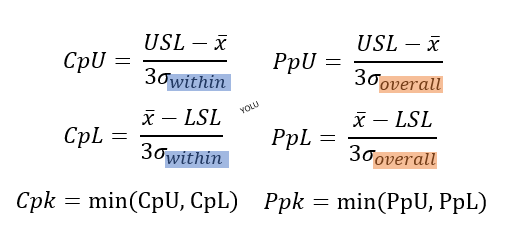계산식을 통해 일반적으로 Ppk에서 산포를 더 많이 포함하기 때문에 Cpk보다 값이 더 낮게 나올 수 밖에 없다는 것도 알 수 있습니다. 계산식의 분모가 커지기 때문이겠죠?