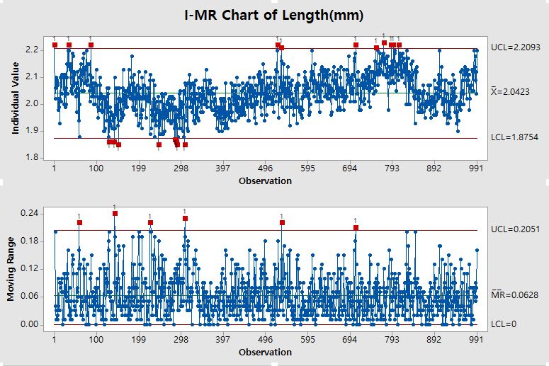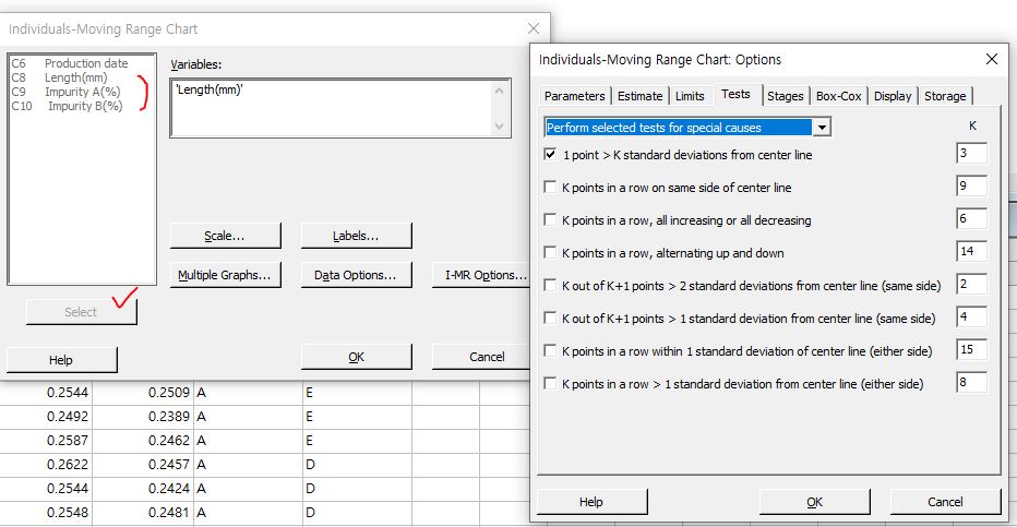 SPC 관리도를 보시는 이유는 대부분 슈와츠 룰에 따라 이상점을 활용하는 용도로 사용하실겁니다. 이 규칙을 I-MR 옵션에 들어가시면 설정이 가능하며 기준도 조정이 가능합니다. 아무설정을 하지 않으시면 위와 같이 3시그마 관리선을 이탈하는 데이터가 이상점으로 구분됩니다.