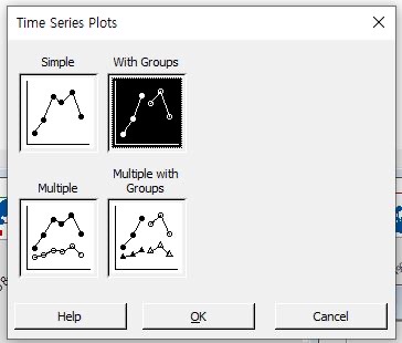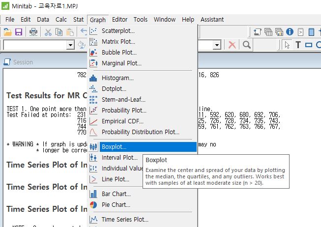 저의 경우에는 부분군이 없는 개별데이터이기 때문에 I-MR chart를 선택했습니다. Moving range chart를 보고싶지 않으실 경우 위 선택메뉴에서 Indivisual chart로 선택하셔서 보시면 됩니다.