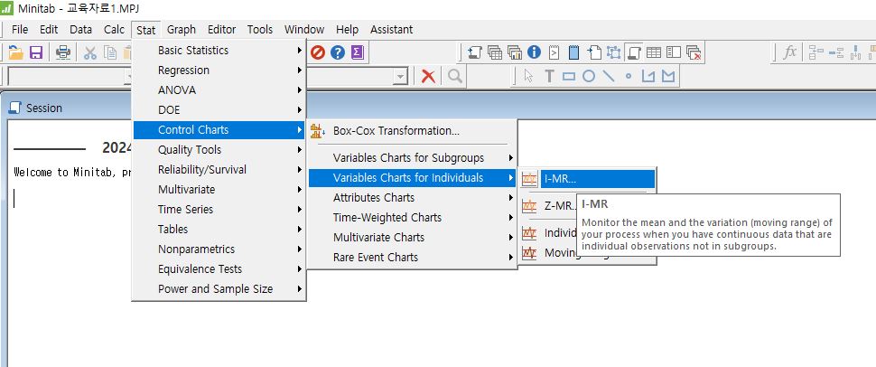 • 관리도는 Stat(통계) - Control Charts(관리도) - 데이터 유형에 따라 관리도 선택