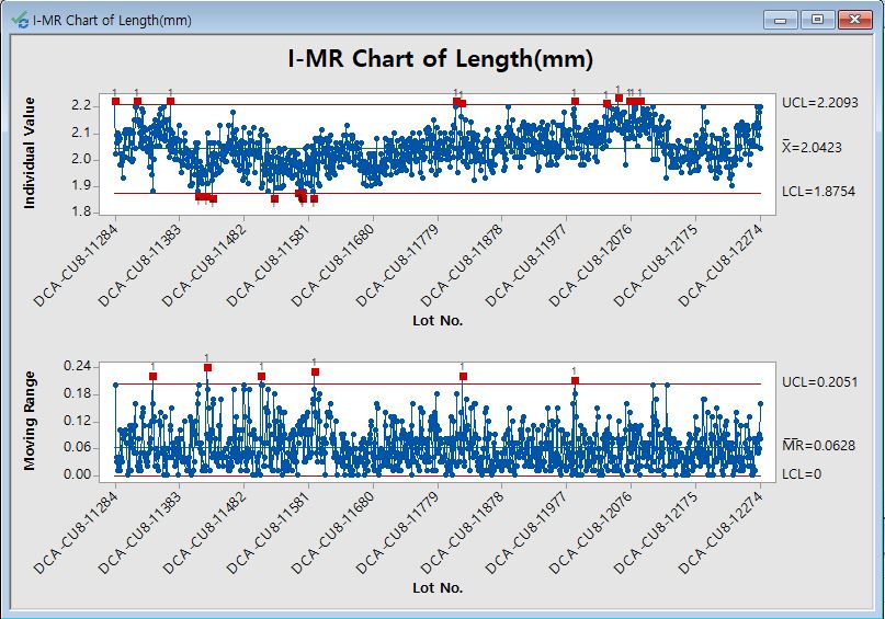관리도는 아래와 같이 표기되며 관리기준 이탈 데이터는 붉은색 점으로 표기됩니다. 숫자가 1로 표기되는데 1번 룰을 이탈하였다는 의미입니다. 제가 위에 설정할때 1번 룰만 체크하여 그런 것이죠.