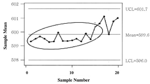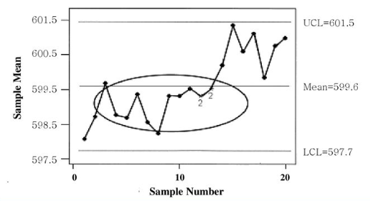 연속된 6개의 타점이 증가 또는 감소하는 경우입니다. 이런 경우 원재료의 점진적인 품질 변화가 있거나 설비 또는 금형에 점진적인 마모, 온도 변화로 인한 특성 변화 등이 있을 수 있습니다.