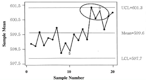 연속된 9개의 타점이 중심선을 기준으로 한쪽에 몰려있는 경우입니다. 이런 경우는 보통 원재료 특성 자체의 변화 또는 공정 조건이 오 설정된 경우 또는 설비 보전이 진행되지 않아 제품 또는 공정 특성이 변화한 경우입니다.
